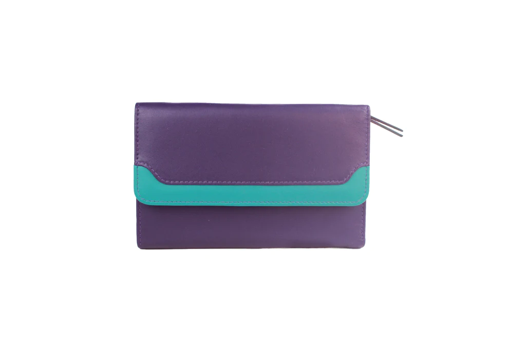 Genuine Soft Leather Purse RFID protection with contrast panel detailing Purple & Turquoise