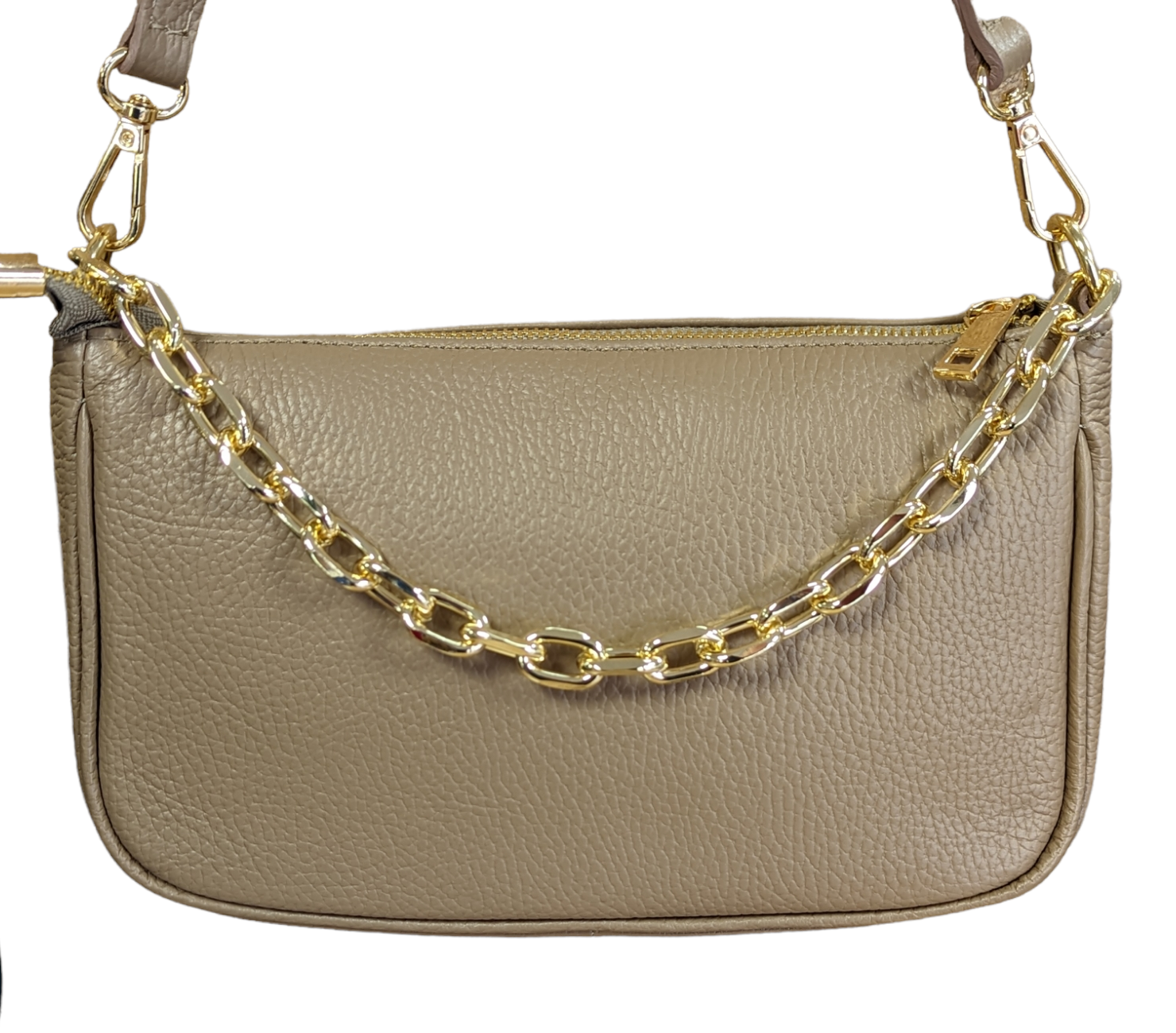 Italian Leather Shoulder Bag/ Clutch with Gold Tone Metal Chain Detailing – Gabriella Dark Beige