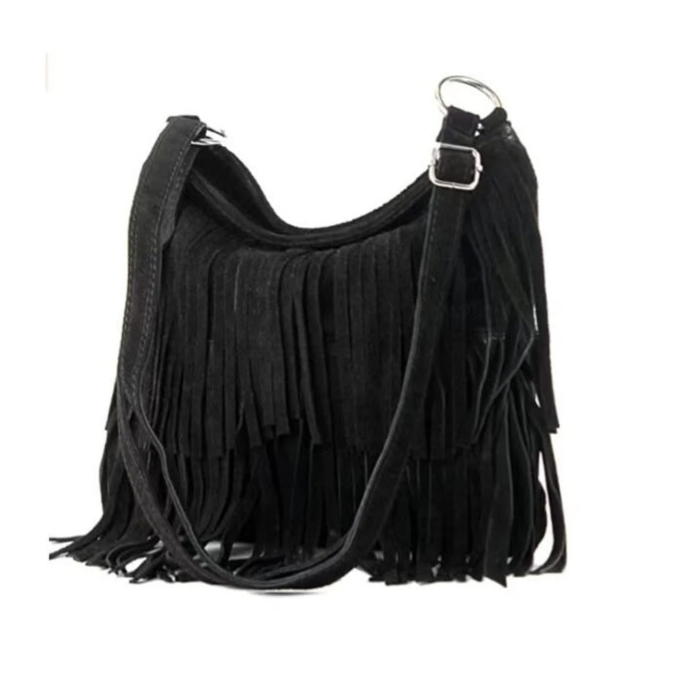 Italian Leather Suede Leather Double Fringe Cross Body Handbag – Swolit Chica Black