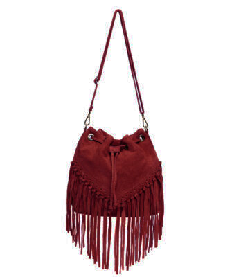 Italian Leather Suede Leather Fringed Bucket Bag Knott Detailing- Anna Burgundy