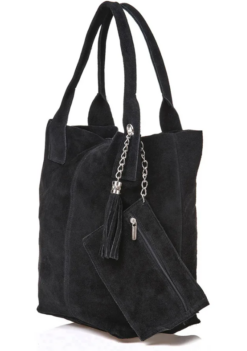 The large Italian tote bag is made of the highest quality natural suede. The design of the bag fits perfectly into looser, everyday styles. The bag’s fashionable style is enhanced by a tassel placed at the front, with a small insert fastened with a zipper, measuring 13×19 cm. This model is very practical, universal and timeless. The bag is very roomy and can easily accommodate A4 format and all other necessary items. Thanks to the optimal length of the handles, the bag can be carried in the hand, on the forearm or on the shoulder. It will look very good in any version. The model is single-chamber, closed with a zipper. Inside there is one zipped pocket. The interior of the bag is finished with a durable cotton lining. The model’s fittings are silver, which further emphasises its fashionable style.