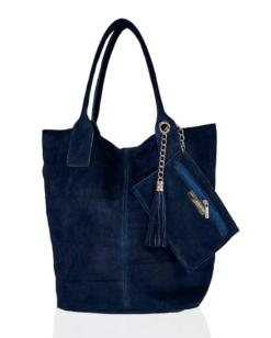 The large Italian tote bag is made of the highest quality natural suede. The design of the bag fits perfectly into looser, everyday styles. The bag’s fashionable style is enhanced by a tassel placed at the front, with a small insert fastened with a zipper, measuring 13×19 cm. This model is very practical, universal and timeless. The bag is very roomy and can easily accommodate A4 format and all other necessary items. Thanks to the optimal length of the handles, the bag can be carried in the hand, on the forearm or on the shoulder. It will look very good in any version. The model is single-chamber, closed with a zipper. Inside there is one zipped pocket. The interior of the bag is finished with a durable cotton lining. The model’s fittings are silver, which further emphasises its fashionable style.