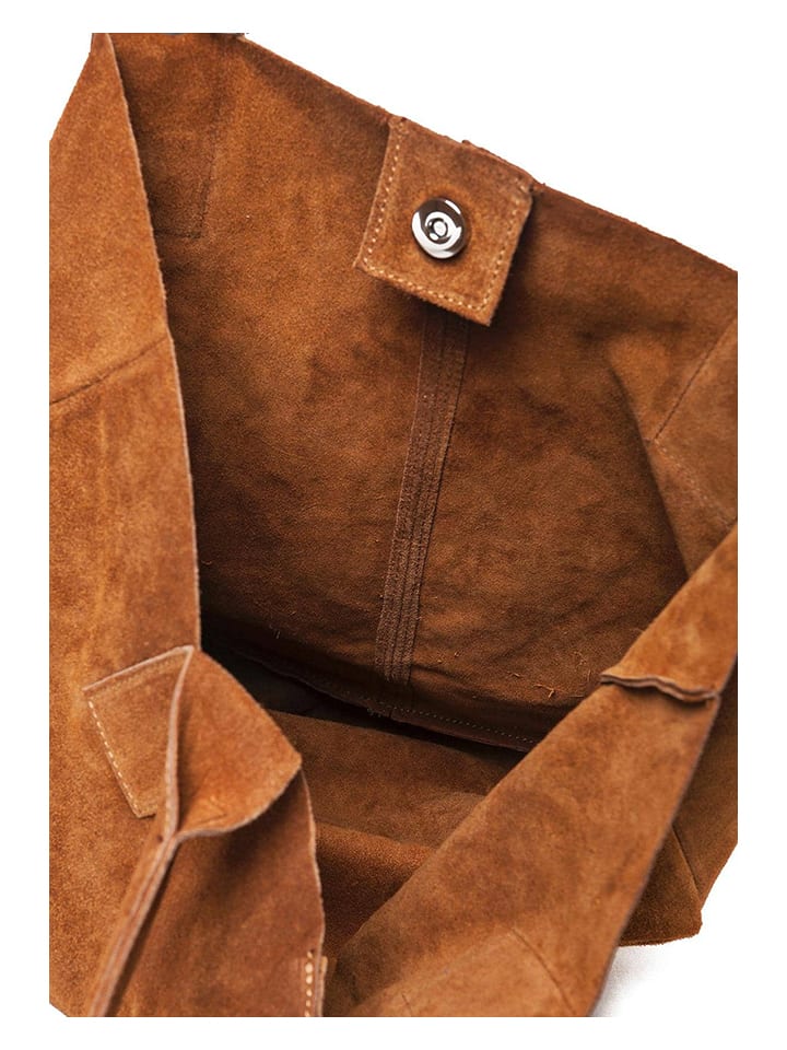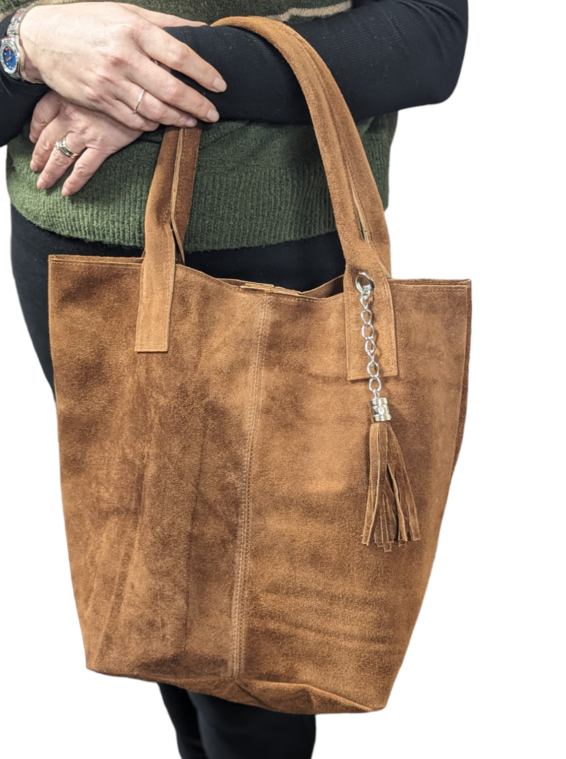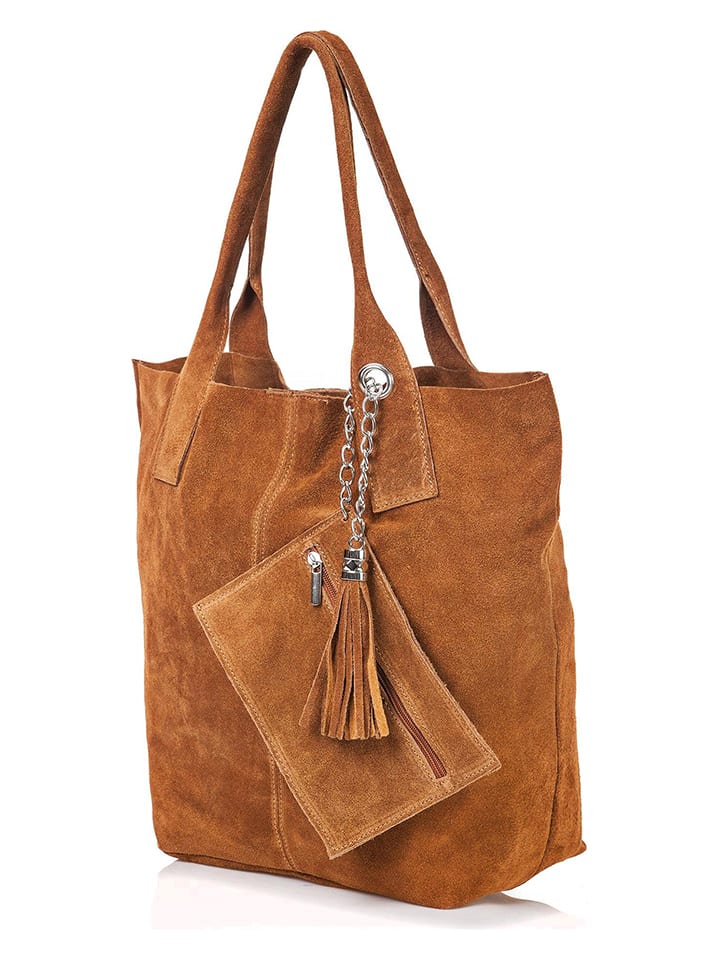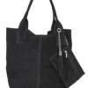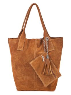 The large Italian tote bag is made of the highest quality natural suede. The design of the bag fits perfectly into looser, everyday styles. The bag’s fashionable style is enhanced by a tassel placed at the front, with a small insert fastened with a zipper, measuring 13×19 cm. This model is very practical, universal and timeless. The bag is very roomy and can easily accommodate A4 format and all other necessary items. Thanks to the optimal length of the handles, the bag can be carried in the hand, on the forearm or on the shoulder. It will look very good in any version. The model is single-chamber, closed with a zipper. Inside there is one zipped pocket. The interior of the bag is finished with a durable cotton lining. The model’s fittings are silver, which further emphasises its fashionable style.